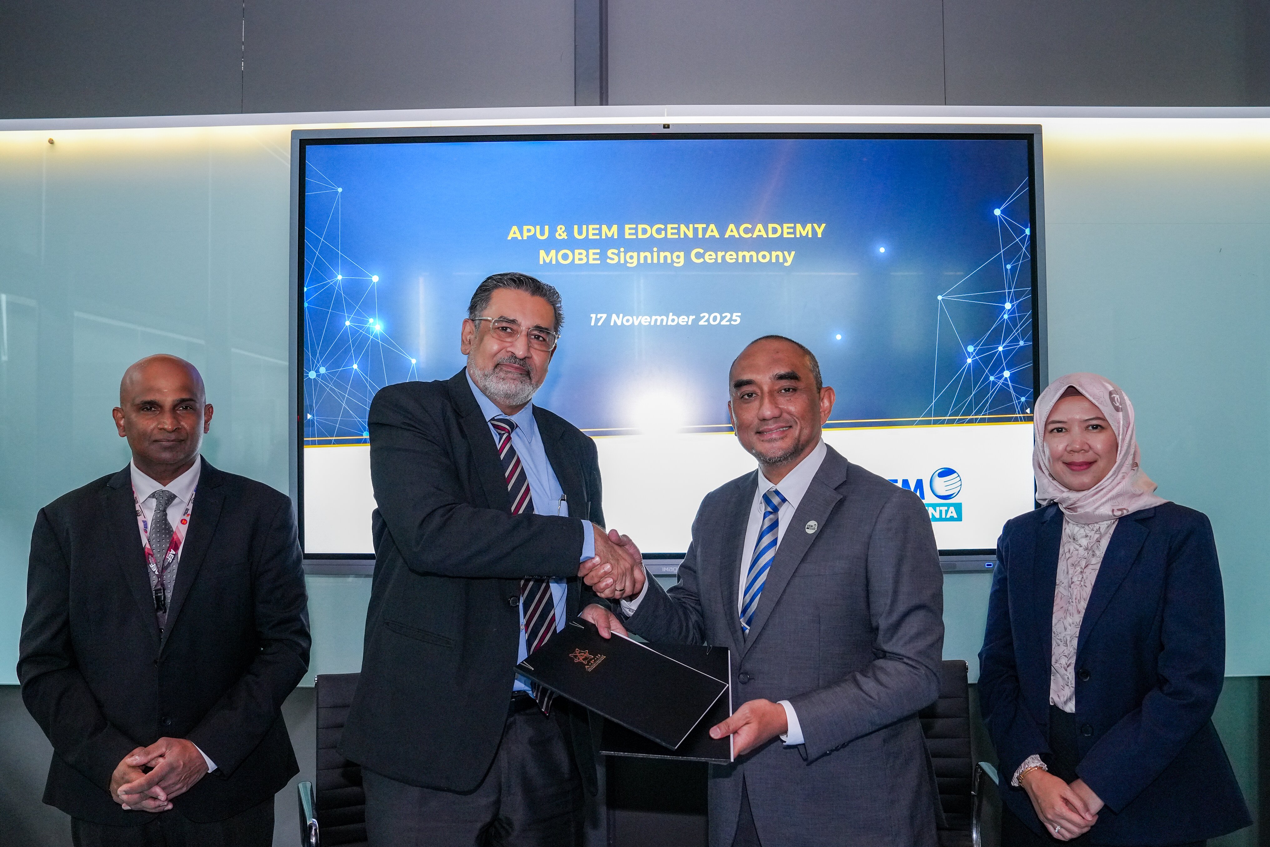 KUALA LUMPUR, 17 November 2025 – UEM Edgenta Berhad (“UEM Edgenta” or “the Company”), Malaysia’s leading Asset Management and Infrastructure Solutions company, through its the learning and development arm, Edgenta Academy Sdn Bhd (EASB), entered into a Memorandum of Business Exploration (MOBE) with the Asia Pacific University of Technology & Innovation (APU) to explore potential collaborations in areas encompassing training, research, industry engagement, and regulatory development.